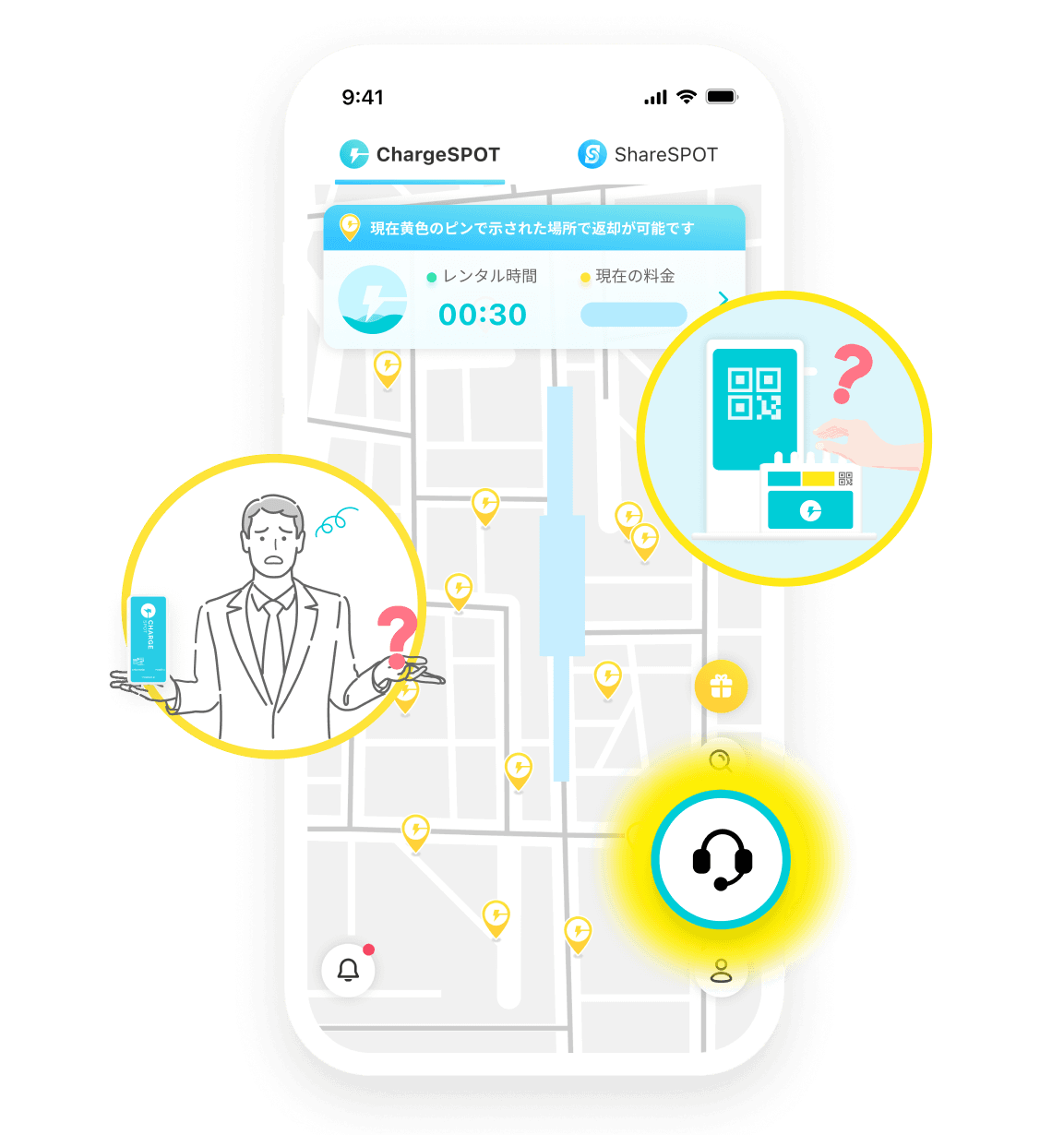 CHARGESPOTご利用時のお問い合わせは、アプリ右下のアイコンをタップしてカスタマーサポートまでご連絡ください